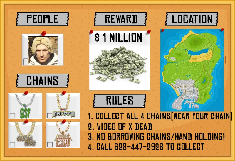 On October 28th 2021, Mr. Kebun decided to use the money stolen from the vault to host a bingo-style game. He named this "The X Games" and it involved people collecting/stealing chains from Chang Gang, The Families, The Mandem and the Vagos, the final task was to take a picture ofJean Paul dead. This event caused the city to ignite, people packed into groups of 4 and set out to steal chains and hunt down X.