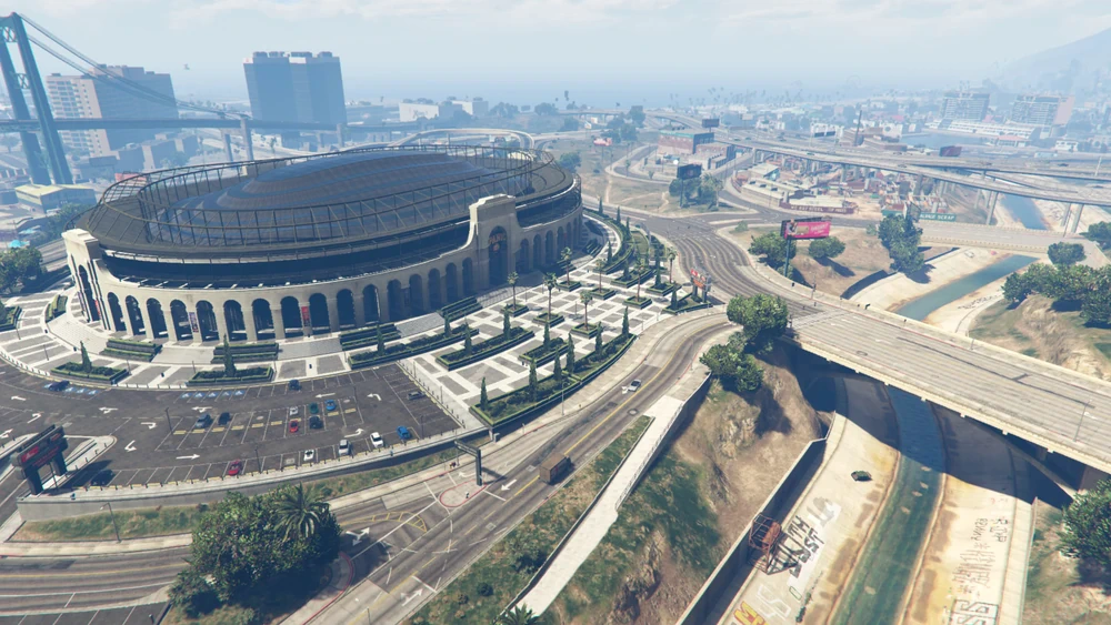 La Puerta was historically an industrial district marked by dilapidated buildings and warehouses. Today, many of these structures stand abandoned, serving as hubs for gang activity, particularly in the northern area. Conversely, the southern section bustles with activity, hosting attractions like the Maze Bank Arena and thoroughfares leading to the city airport. Positioned along routes from the Los Santos International Airport, La Puerta serves as a gateway to the city for arriving travelers.