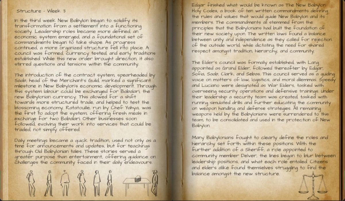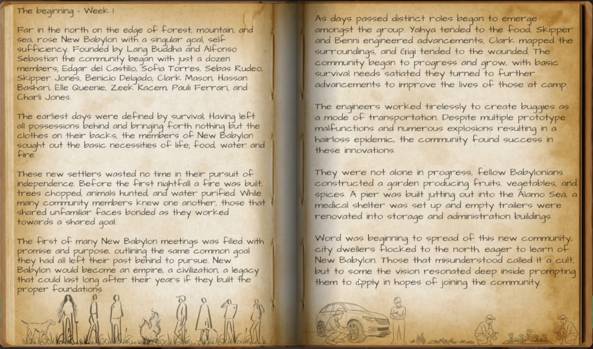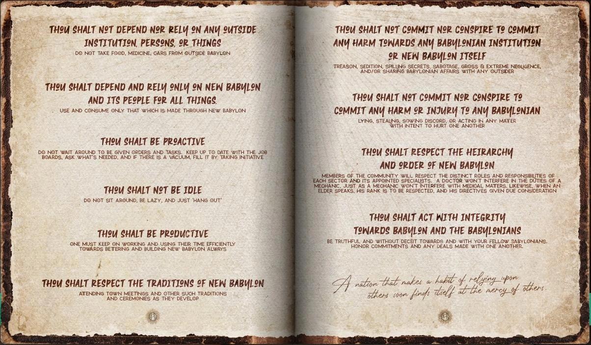| TBA - Lionswatch Militia | Protect and guard New Babylon | Luciano DiCenzo, Harry B | Andi Coots, Devon Jones, Clark Mason, Michal Bazin, Thaddeus Donkersloot, Jr., Pilot Jimmy Jones, Lars Haverford | Military / Law Enforcement ran by Luciano to provide security and order to New Babylon |