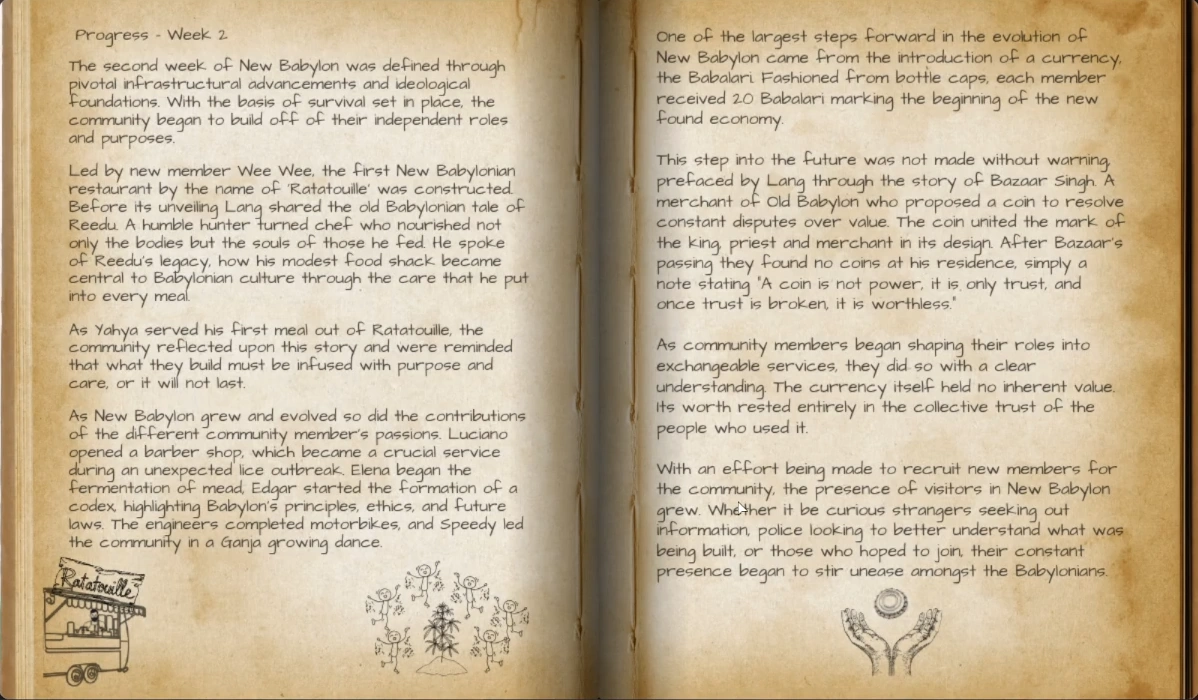 The currency of New Babylon is Babalari. A coin created and implemented by The Elders with the purpose of creating economic motivation and providing further purpose for the Babylonians.