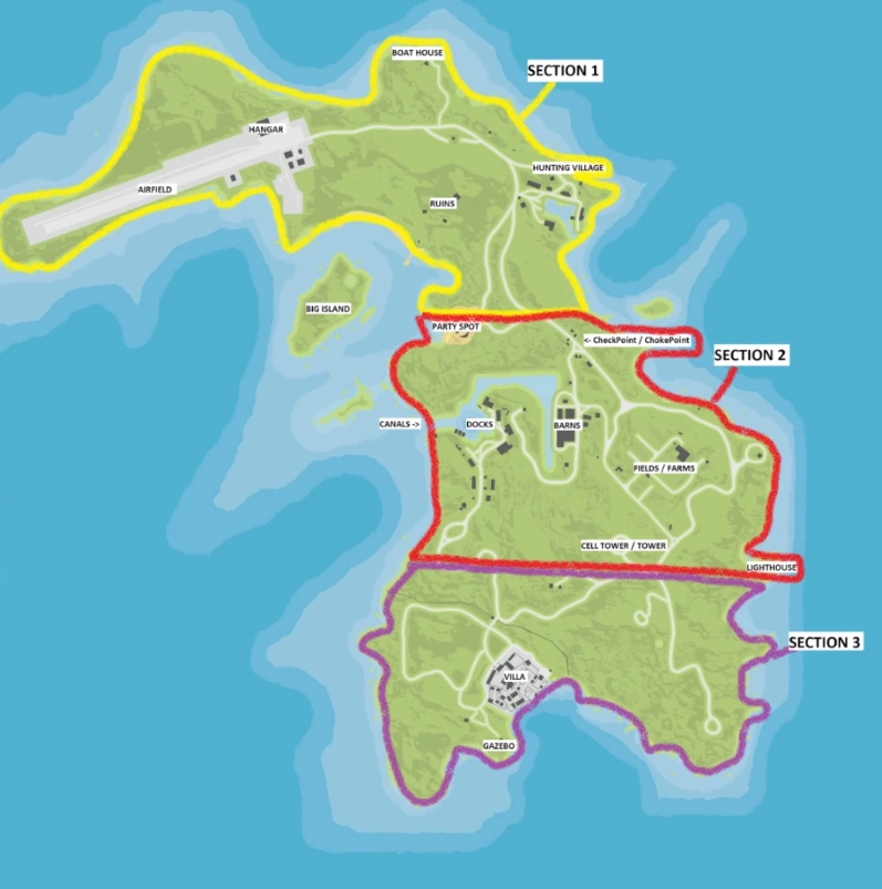 The island is fortified and patrolled by armed guards. There is an airport at the north end of the island, where guests to the island arrive. At the south end of the island there is a walled compound and villa. On the west shore of the island there is a marina with boats that may be used to return to Los Santos.