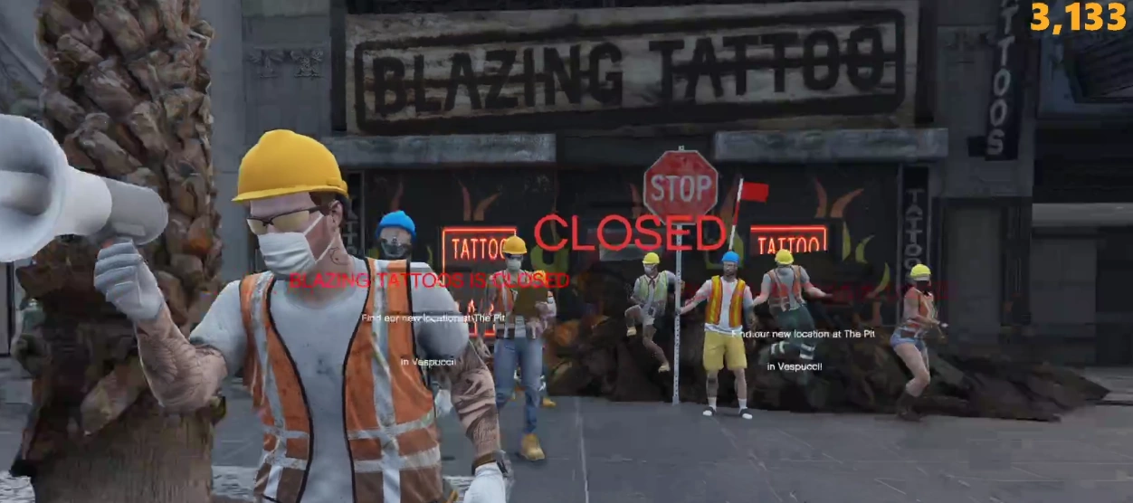 After seeing how much business the Blazing Tattoo parlor in Vinewood was getting, the BBMC planned a mission to "take out" their competition. On the 7th of June 2022, armed with C4, the club rolled up in disguise as a construction crew, complete with jackhammers and utility vehicles. They scared off the customers and began dismantling the shop, taking everything of value, from the ink guns to the cash register. Then Pez threw a sticky bomb inside the front door and destroyed it instantly. An hour and a half later the brand new Pit Tattoo Parlor was up and running in Vespucci.